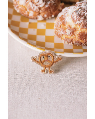 Avec un bretzel brodé sur un fond pailleté, la broche Des Petits Hauts se veut fun et pleine d'originalité pour l'automne.